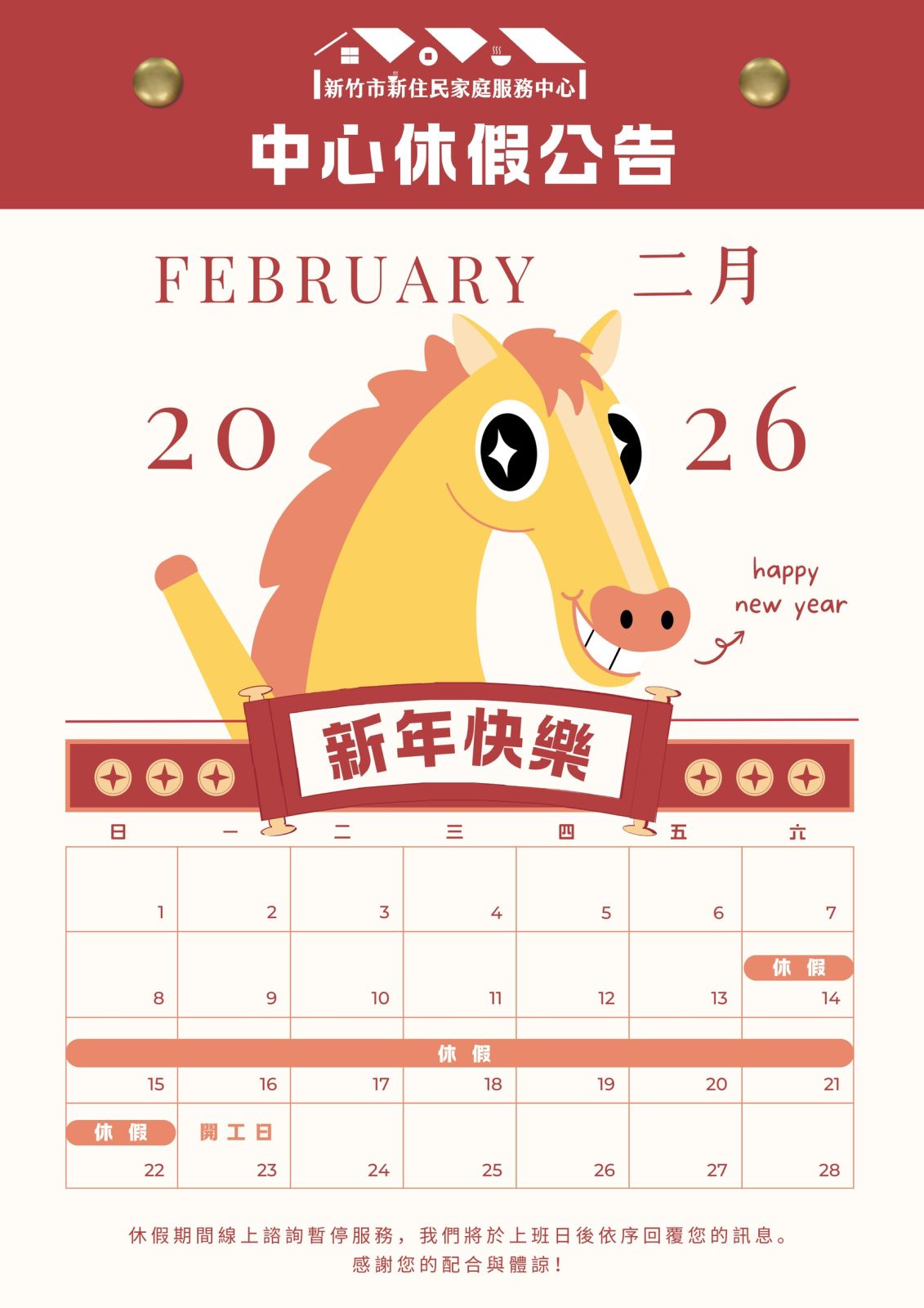 中心於 2026年2月14日(六)至 2月22日(日)休假,2月23日(一)正式上班。